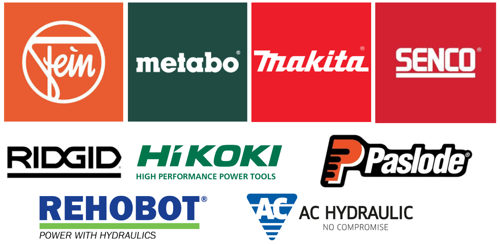 Fein, Metabo, Makita, Senco, Ridgid, Hikoki, Paslode, Rehobot samt Ac Hydrualic.